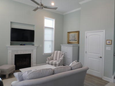 1st Floor has 12 ceilings and very spacious. All brand new appliances and furnishings. Across the street from the beach. Beautiful covered front and rear porches furnished. Full enclosed garage (enough room for 2 cars in the rear area, plus storage) Garage key pad, access to shared bikes. 4 bedrooms: (2)King (2)double twins all have ceiling fans and smart tv s. (5) smart tv s total...with cable access as well. Fast secure internet. Washer and dryer in unit!