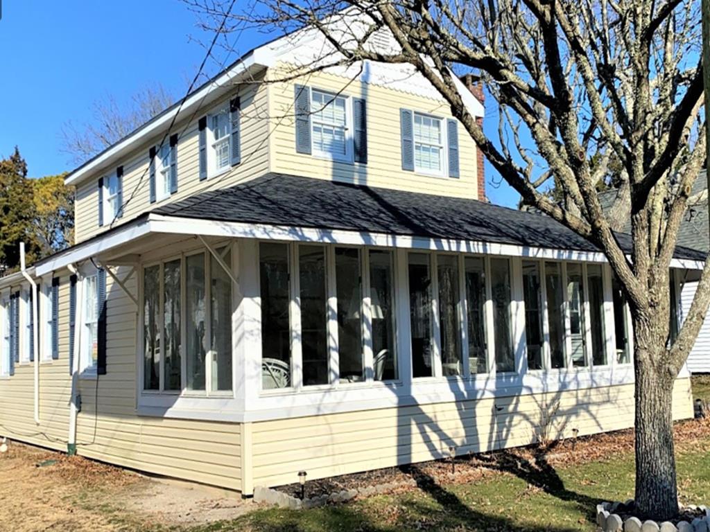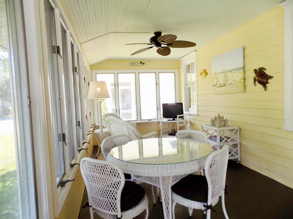 409 Princeton, Cape May Point. This well loved, recently renovated family home overflows with serenity and cozy feelings. The large three season room with an abundance of windows will allow you to feel the beach breezes for all to enjoy. The house sleeps 8 comfortably and features AC units in all the bedrooms, kitchen and living area. There is 1 full bath with a walk in shower along with an enclosed outdoor shower available. On the 2nd floor is a convenient half bath. The kitchen boasts new granite counter tops and appliances including a dishwasher. There is an eating area along with a washer and dryer associated with the kitchen area. There is a large flat screen TV in the living room. There is also a smaller TV on the three season porch for the sports enthusiasts who wants to watch the big game. In the dining room is a large table with 8 chairs for comfort. There are 2 bedrooms downstairs and 2 bedrooms upstairs. Each room has 2 full size beds except the downstairs back bedroom which boasts a queen size bed. There is plenty of space for parking with driveway access and road frontage parking. An old large oak sits adjacent to the house and shades it from the summer heat. The backyard is fenced in with 2 gate entry ways from either side of the house. Contact Jersey Cape Realty, 609-884-5800 or Rentals@JerseyCapeRealty.com , for details or reservations. CLEANING FEE ON ALL RENTALS.**