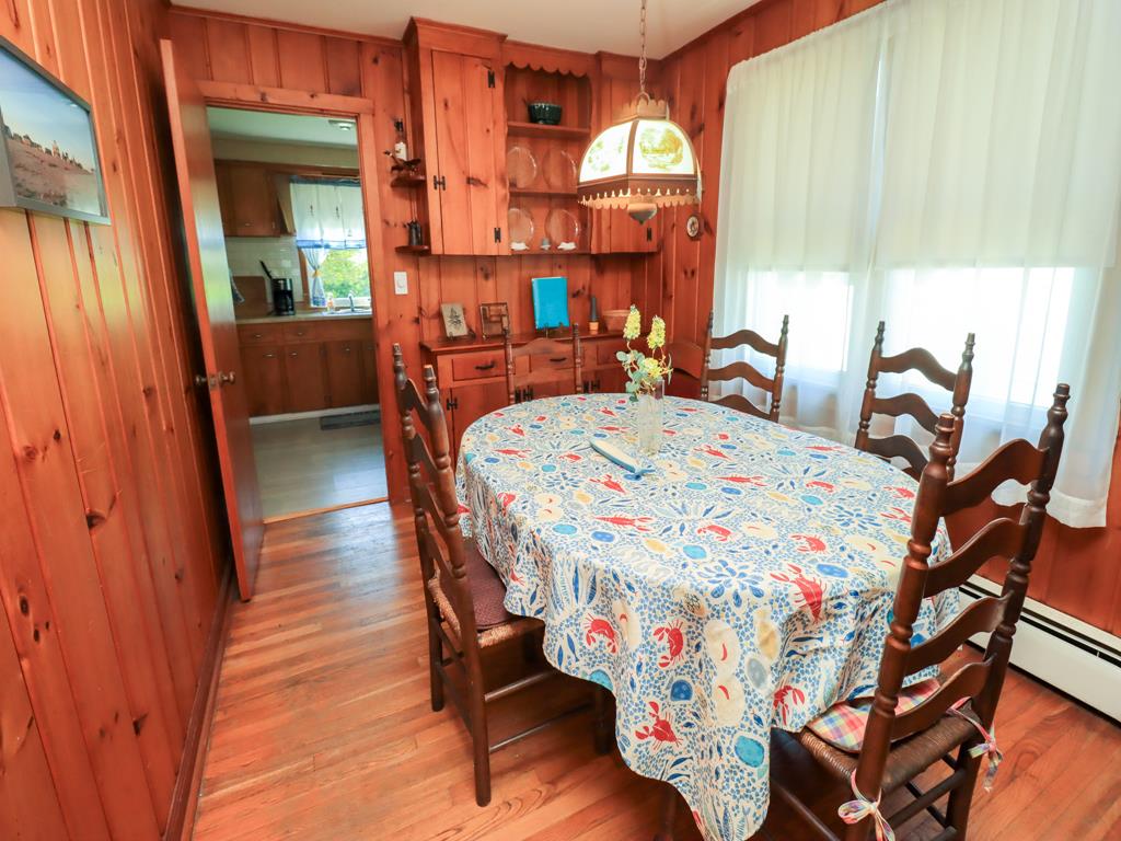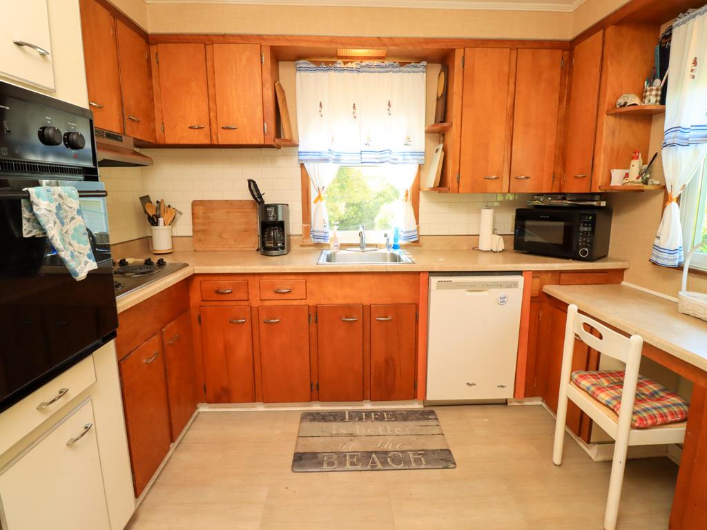 onto a deck and fenced in dog friendly wooded yard. For inside dining, there is a separate dining room with seating for 6. The kitchen offers all you need for your meals. We offer central air, new windows, gas and charcoal grills, outdoor furniture and an enclosed outdoor shower with hot and cold water.