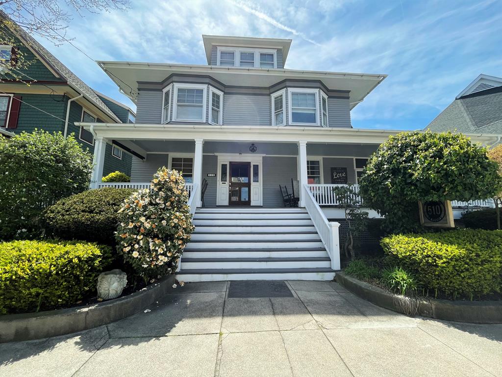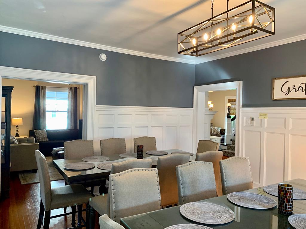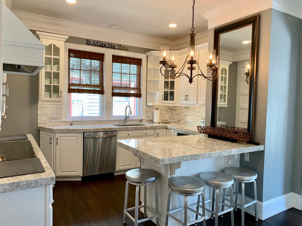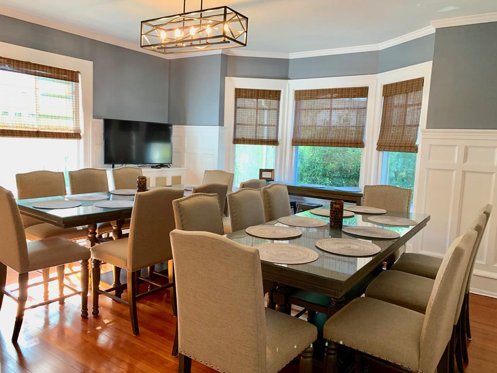 Welcome to The Big House! What makes our house different? THE LOCATION. It’s THE place to be! Come vacation in the center of it all without the noise or traffic. Our house is located in Cape May Proper on a lesser-traveled portion of a one-way street, yet smack-dab in the middle of everything! You’ll be amazed at how tranquil the location is, while being in the center of the Historic District and steps to the pristine beaches of the Atlantic Ocean. This section of Hughes Street is a one block long, one-way cross section located between Decatur Street and Ocean Street… a little slice of heaven on earth.THE PORCH. When in Cape May, it’s ALL about the porch…and what a porch it is! Ours is one of the largest and widest (700 sq feet). The front porch measures 48 ft long with a screened-in side porch that is equally as wide and measures 20 ft long. There is plenty of outdoor space for your family and friends to gather and enjoy the beautiful streetscape of the neighboring multicolored Victorian homes. THE PARKING. Our ONSITE parking area, located directly behind the house, is one of the most spacious for a private home in Cape May Proper. Easily park 6 cars in designated spots for quick in and out, without having to move another family member’s car. Stack park additional cars (up to a total of 10) in the driveway when needed. Everything you need is within walking distance: beach, restaurants, shops, grocery store, parks and more. HISTORY OF THE HOUSE. Our house was custom built in the early 1900’s to specifically accommodate the new Reverend of the Presbyterian Church located next door. A small Victorian cottage was moved from this location in order to build this much larger home with its more open/modern floor plan, which was not the typical design used in surrounding Victorian houses of the 1800’s. You’ll notice the stained glass windows, which are original to the house, bear the fleur-de-lis signifying the symbol of the Holy Trinity and fitting for the Reverend’s expansive new manse. THE SPACE. Maximum of 20 guests -- adults and children, Second floor (sleeps 10): 4 bedrooms, 4 bathrooms, Third floor (sleeps 12): 4 bedrooms, 2 bathrooms. There is a Newly remodeled full kitchen with induction stove-top, commercial hood fan, convection oven, drawer microwave, deep stainless steel sink, refrigerator/freezer with ice maker/water dispenser, under counter lighting, Butler’s Pantry with extra microwave, separate bar area with beverage refrigerator and sink, counter seating for 4, cable TV, Dining Room.