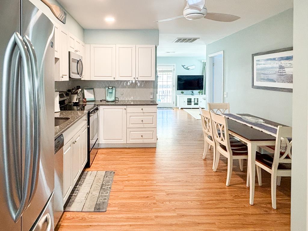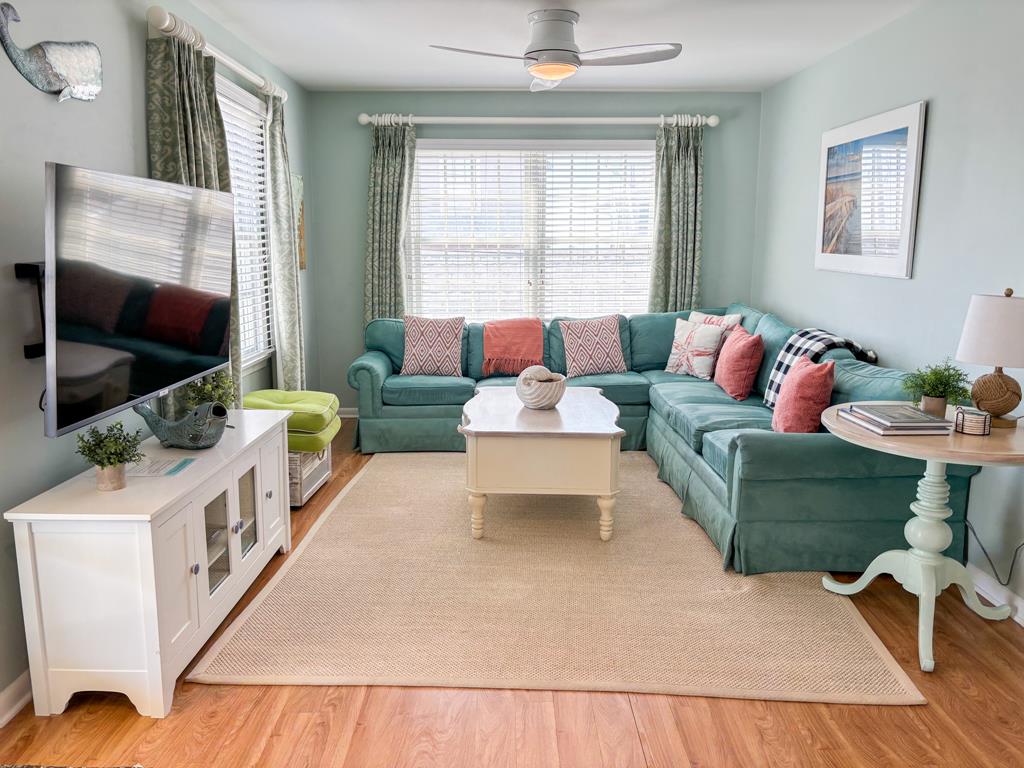 Beautifully appointed 2nd floor beach block condo. A shared deck offers amazing ocean views. This updated home offers not only comfortable furnishings and high speed internet but also close proximity to the beach, promenade, restaurants and entertainment. Master bedroom with queen bed, second bedroom with two twins and a double-sized sofa bed in the living room. 3 Roku Smart TV s with Hulu +Live TV on all. Fully stocked kitchen with a washer and dryer. Beach amenities available for use. Pet friendly is an added bonus! Dogs under 50lbs are welcome with an additional pet fee. Perfect vacation retreat for those who like to be near the center of it all in beautiful Cape