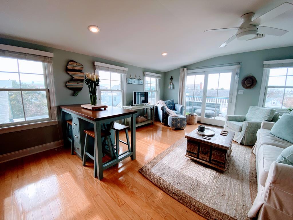 Relax and enjoy the panoramic views and the ocean sounds in this cozy home away from home. This third-floor condo offers two bedrooms, two bathrooms, two on-site parking spaces, and is perfectly located just two blocks from the renowned Cape May beach and the famous Washington Street Mall. This condo is located on the top floor which makes for great views! The stairs will be worth the journey. Once you reach the top deck oasis, you’ll be glad you came. Newly furnished with tons of amenities, this is the perfect getaway for a couple, a few friends who want to enjoy a quiet weekend, or a small family. The living room and kitchen boast beautiful views in every direction. During the day, check out the banner planes as they make their way to the beach. At night, catch a glimpse of the lighthouse beacon making its rounds. The master bedroom features an ensuite with a spacious spa shower. The second bedroom has a great view of historic Windsor Avenue. Sit on the deck that has a couch, love seat and two chairs for a nice family gathering. During peak season, you’re sure to see the horse-drawn carriages make their way to town.