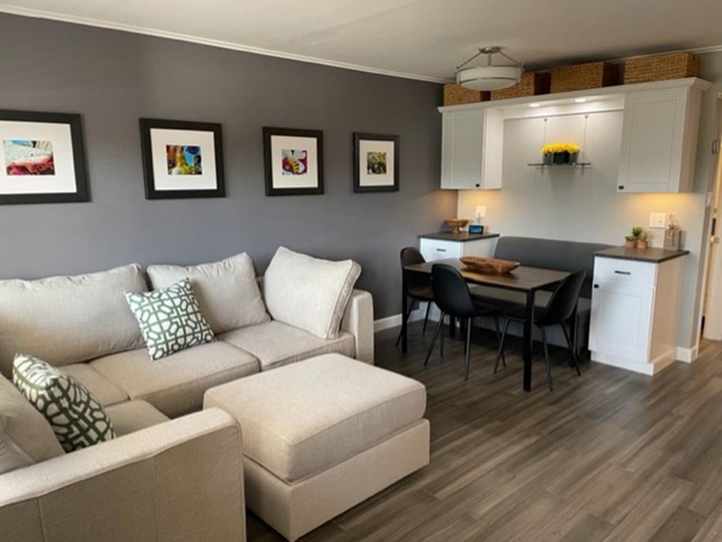 The “ROSE” unit is one of the larger units at Cape Roc with a new kitchen including granite countertops and all modern appliances. The new bathroom enjoys a walk-in shower and a fog free lit mirror. The unit sleeps 6, with two queen beds and a Love Sac couch bed and enjoys more than adequate storage. The “Rose Bowl” inspired photo gallery throughout the unit adds a splash of whimsey to what otherwise is a very sophisticated, yet very comfortable environment.