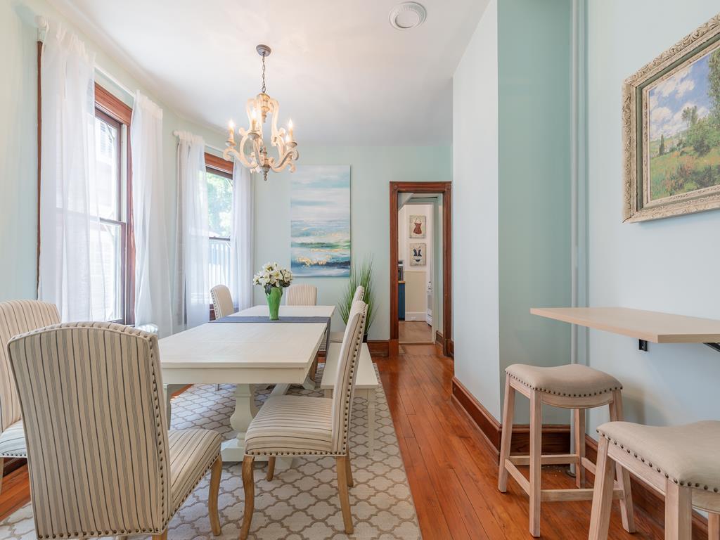 627 Hughes Street is an original Victorian home-circa 1896 on one of Cape May s premier historic streets. This vacation rental is in the heart of the historic district and just 2 ½ blocks to the beach and 1 ½ blocks to the Washington Street Mall. Consisting of 8 Bedrooms and 4 full bathrooms the home has enough space for 19 people to sleep comfortably. Enjoy sitting on your front porch and hearing the clip-clop of the horses and carriages going by. As you enter the home there is an entrance hall with original chestnut doors and staircase with stained glass. The first floor living room with Queen Sofa Bed has original pocket doors that lead into a formal dining room with high ceilings and original hardwood floors throughout. The master bedroom is on the first floor with a queen bed and full bath. The kitchen offers all of the amenities and appliances needed to cook on vacation. Off the kitchen you will find a cozy family room with a Queen Sofa Bed and full bathroom that is designed such that it could also be used as a second first floor master. The family room has sliders to a rear deck overlooking a brick patio and flower gardens for outside entertaining. Your second floor offers three bedrooms, a second kitchen and a hallway bathroom. The second floor is also where you will find the washer dryer in the hallway closet. Off the second floor kitchen is a very large covered deck with an outdoor sectional and bar top table and stools. The largest of the bedrooms has a queen bed and a pyramid bed consisting of a twin bed over a double bed with a pull out twin bed trundle. The second and third bedrooms each have a queen bed. The third floor offers four additional bedrooms. One bedroom has a twin with a twin trundle, two bedrooms have queen beds and the fourth bedroom has a full bed with a private balcony. The third floor also offers a hall bathroom with a small tub/shower. Outside there is a fully enclosed shower, a BBQ gas grille, and private yard. 627 Hughes has all the modern features you could need while on vacation including multiple televisions, Blu Ray Players and Wifi/High speed internet for the whole family to enjoy while also having that historic charm. Amenities such as 8 beach chairs for guests to use and a bike rack are included! There are two parking spots that are located off site. This property can also be rented as a partial house of 4 bedrooms in the off season by not having the third floor accessible. Ask about the discounted price for renting only four bedrooms which can sleep up to 11 guests in bedrooms/15 guests using pull out beds. This property will have a $200 cleaning fee added to all reservations less than a 7-night stay. This will not show on the online quote and will be added once reservation is received. This homeowner does not provide blankets at the property. All guests must bring their own blankets, sheets and bath towels for their stay. This property does not allow pets and no smoking anywhere on the premises.