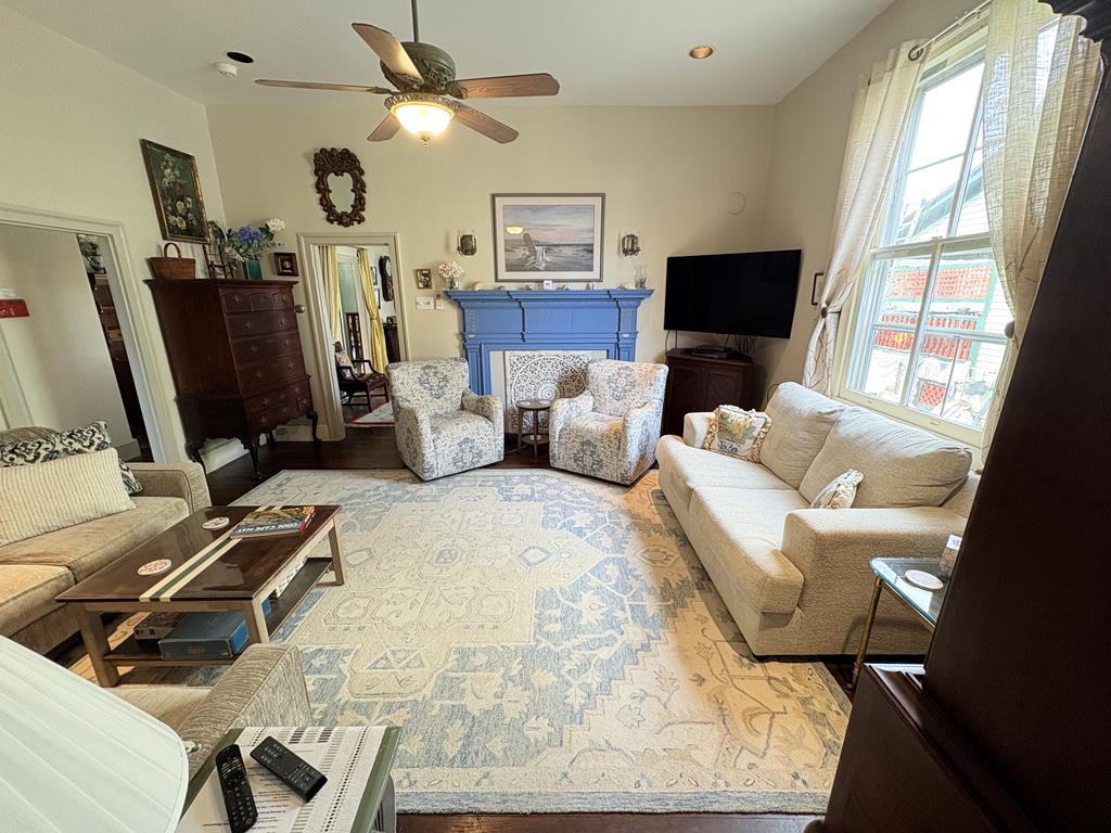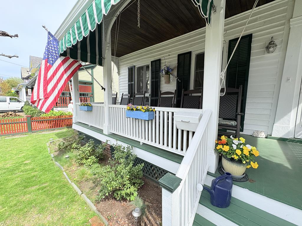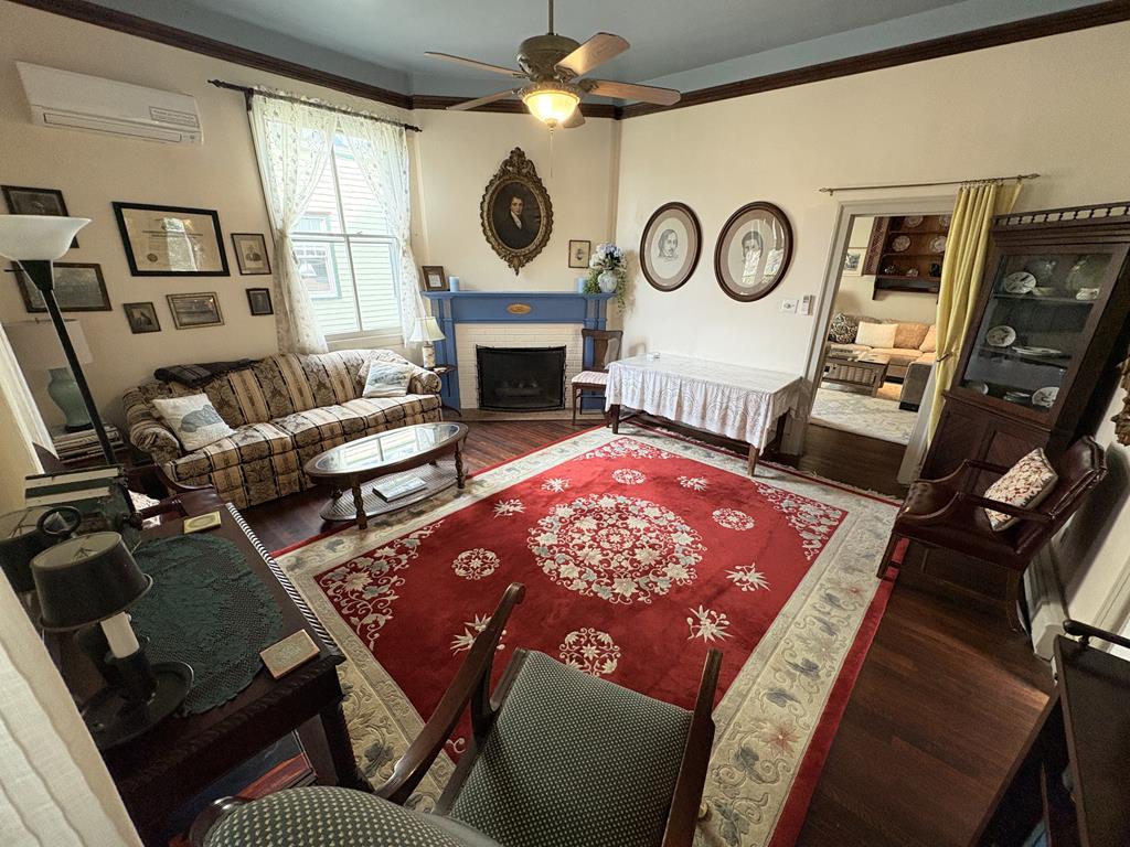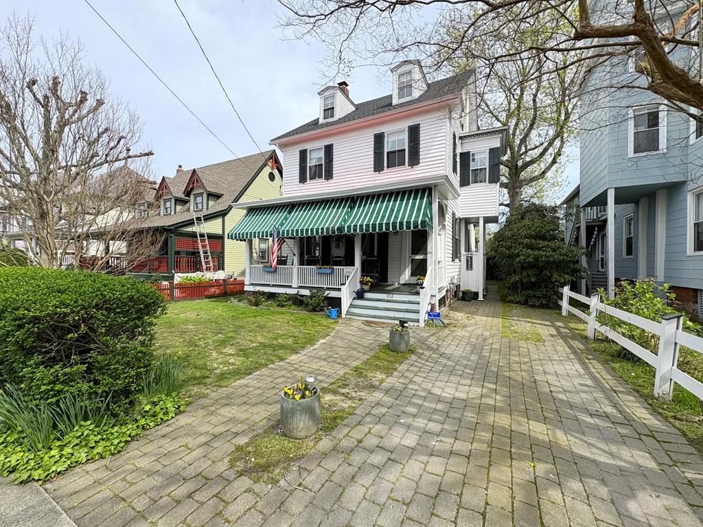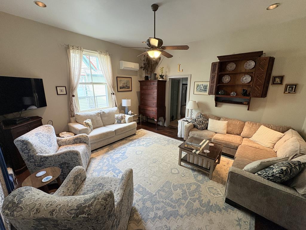 PET FRIENDLY Spacious 8 bedroom, 4 1/2 bath historic family guest house in heart of town on Cape May s "oldest residential street". Walking distance to everything-beach, town, shopping. Parking for 3 cars. 5 TV s (family room high definition), 2 DVD player, wireless internet, beach box with beach chairs (we cannot confirm or guarantee a number) Front porch rocking chairs to relax. Bedroom configuration 1st floor-1 full size bed with ensuite bathroom (large walk in shower), , 2nd floor (3 bedrooms) 2 Queen size beds 1bedroom Full size bed, 3rd floor (4 bedrooms) 2 with full size bed with single trundle underneath, 1 with twin trundle set and 1 with set of twin beds. Window AC in all bedrooms including the first floor bedroom. The first floor has 3 split AC units; one in each room for the living room, tv room and the kitchen.