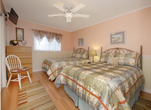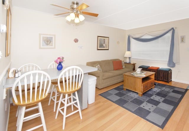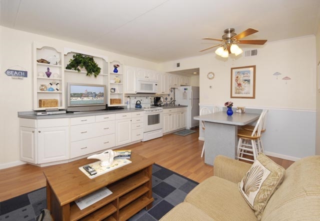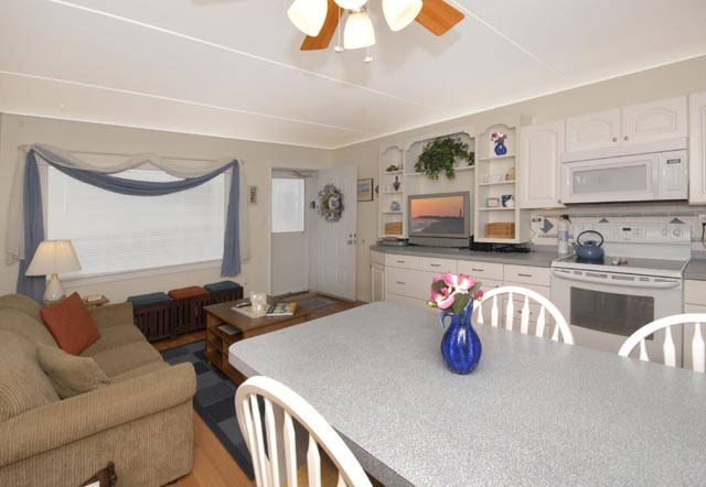 Our bright, well-appointed one bedroom Cape Roc condo is ready for your family’s summer enjoyment.Officially designated a National Historic Landmark city, Cape May’s renowned family beaches and historic sights will awaken your senses, while you relax in the cozy comforts of your fresh, summer-white kitchen with full sized appliances, a porcelain tile bath, a bedroom with two full-sized beds, and a sleeper sofa in the living room. Walk a half block to the beach, or enjoy a cool dip in our heated pool. After your day of sun and family fun, stay connected to that world outside, with our private high-speed wireless internet access, using your laptop or techie iTablet device.